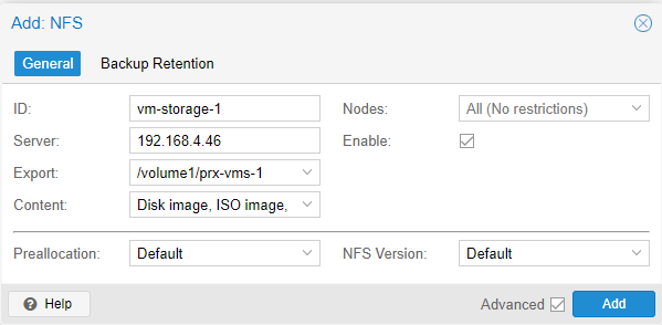 In Content above, we decide what this shared storage can be used for, like for VM disks, ISO images etc. We have defined one for virtual machines above, let us define one for backups also:
