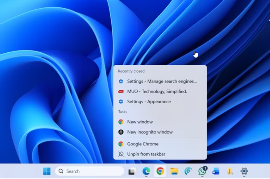 Și acest lucru nu se limitează doar la File Explorer. Pot face clic dreapta pe pictograma Word din bara de activități pentru a deschide documentele la care am lucrat recent. În mod similar, dacă fac clic dreapta pe pictograma Edge, mi se afișează spațiile de lucru, site-urile preferate și filele recente. Opțiunile pe care le vedeți aici variază în funcție de aplicație, așa că asigurați-vă că le verificați pentru aplicațiile preferate.