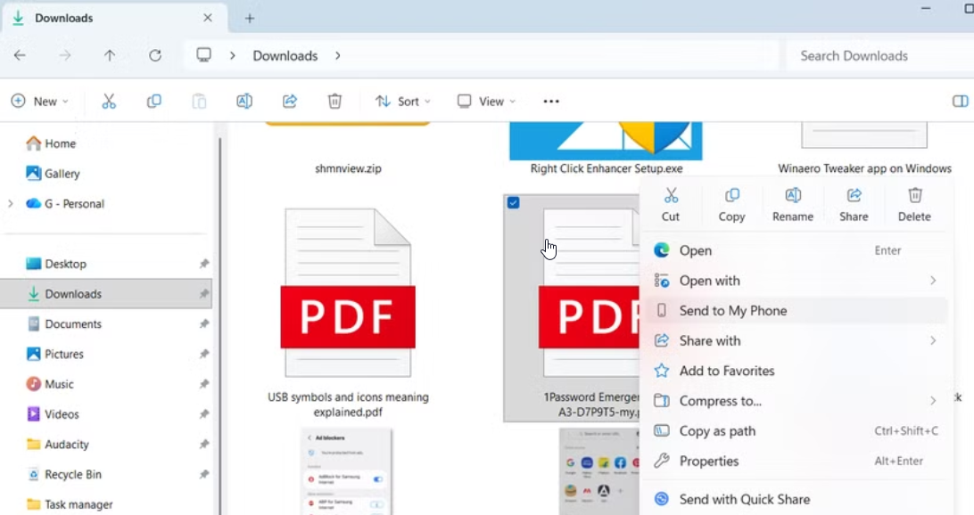 De exemplu, dacă vreau să mut o fotografie, un document sau o captură de ecran, pot să dau click dreapta pe fișier și să aleg opțiunea Trimite către telefonul meu. Atât. Dacă ai mai multe telefoane conectate, poți să dai mai întâi clic pe opțiunea Partajare și apoi să alegi dispozitivul din listă.