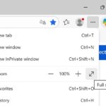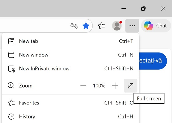 Apasand pe icon-ul diagonal arrow din meniul Settings and more (…) -> Zoom va trece browser-ul in full screen mode.