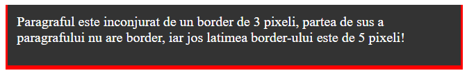 Paragraful este inconjurat de un border de 3 pixeli, partea de sus a paragrafului nu are border, iar jos latimea border-ului este de 5 pixeli!