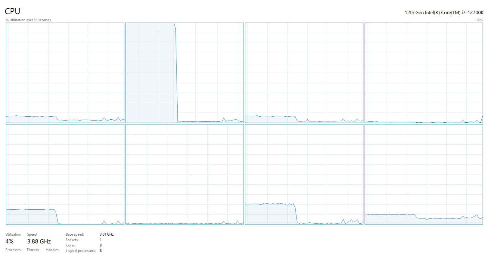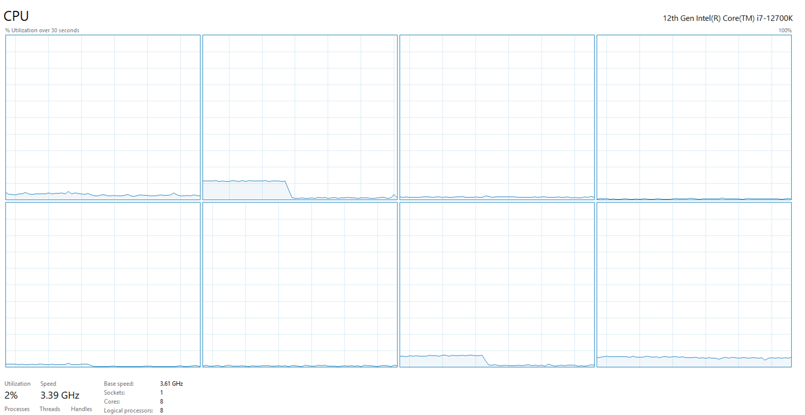 Fara a apela la aplicatii terte am folosit task manager deoarece dispune de o rata de esantionare de 2 hz (View – Update Speed – High) raportat la 1hz disponibil in Performance Monitor: pentru a genera suficiente schimbari de pozitie s-au folosit 1600 dpi si efectuat miscari circulare facand drag la o fereastra cu mentiunea ca nu s-au atins marginile ecranului.