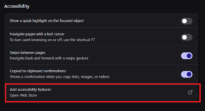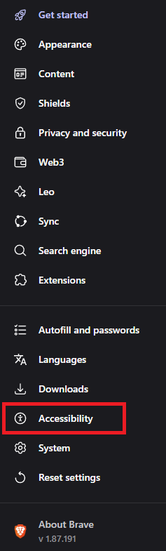 Cum accesati optiunea “Add accessibility features” in browser-ul Brave Data 28/02/2026 Autor preda silviu Categorie Soluții 3 97 Configurare noua (How To) Situatie Solutie Pasi de urmat Prima data deschideti browser-ul “Brave” In coltul din dreapta sus, click pe cele 3 bare pentru a deschide lista de “Options” Click pe “Settings” In meniul din partea stanga click pe “Accessibility” Dupa care din dreapta selectati “Add accessibility feature” Se va deschide un nou tab cu multiple feature-uri pentru browser. Tip solutiePermanent Voteaza Up Down (13 din 24 persoane apreciaza acest articol) ShareTweetShare Despre Autor preda silviu Solutii Asemanatoare How to run Microsoft Defender full virus scan on Windows 11 1 Cum customizati raspunsurile oferite de AI-ul Leo in browser-ul Brave 5 How to combine multiple storage drives in Windows -2 How to fix a Tombstoned Domain Controller -1 NTLDR lipsește din Windows 10 -4 Combina nume+prenume in Excel 1 Leave A Comment? × Cancel Reply Save my name, email, and website in this browser for the next time I comment. − one = seven