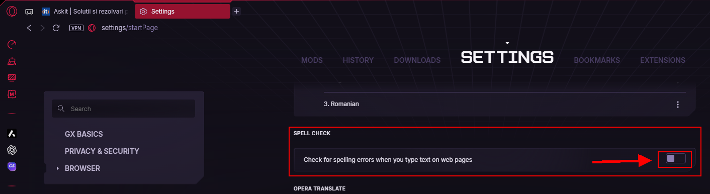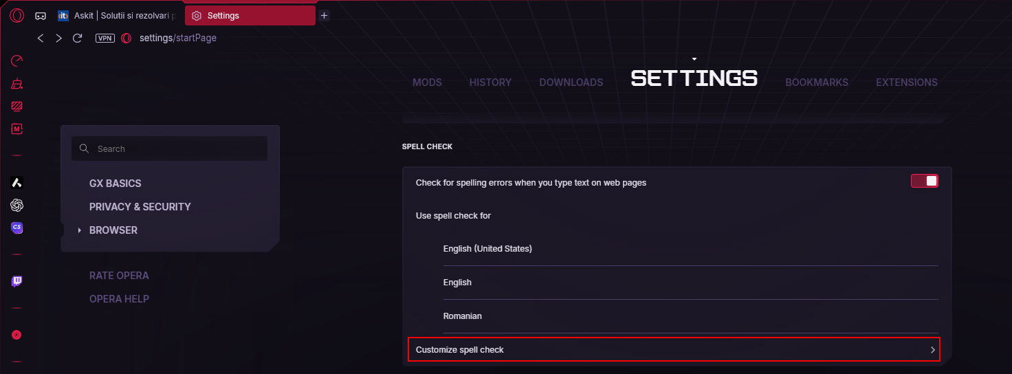 Funcția de Spell Check din Opera GX te ajută să corectezi automat greșelile de scriere în timp ce tastezi – utilă pentru formulare, comentarii și mesaje online.