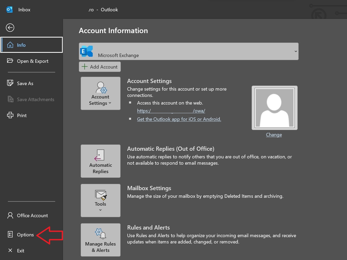 Pentru a activa butonul de Focused Inbox trebuie din aplicatia Outlook sa dam click pe File, apoi Options