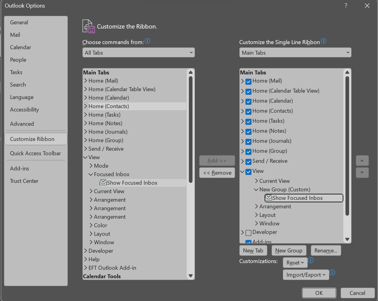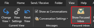 - Imediat dupa, din coloana din stanga, cautam sub View for Focused Inbox, il selectam si facem click pe butonul de Add din mijloc pentru a-l adauga in sectiunea Vizualizare din dreapta.