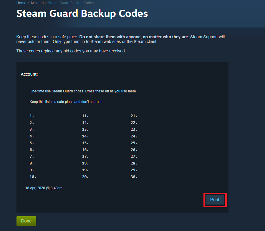 30 de coduri vor fi generate, va recomandam printarea acestora fie ca fisier PDF sau printare normala. Aceste coduri permit cu usurinta recuperarea contului in caz ca acesta este pierdut sau parola este incorecta.