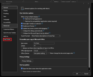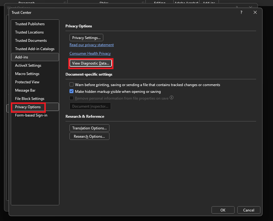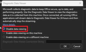 Cum dezactivati “Diagnostic Data viewer” in aplicatiile Microsoft Office Data 01/09/2025 Autor preda silviu Categorie Soluții -1 69 Configurare noua (How To) Situatie Solutie Pasi de urmat Prima data deschideti una din aplicatiile Office, cum ar fi “Word” Click pe “Options” Aici din meniul din stanga, click pe “Trust Center” Mai departe click pe “Trust Center Settings” Prima data din meniul din stanga, click pe “Privacy Options”, dupa care click pe “View Diagnostic Data”. Aici puteti dezactiva optiunea de “Diagnostic Data Viewer”. Tip solutiePermanent Voteaza Up Down (1 din 3 persoane apreciaza acest articol) ShareTweetShare Despre Autor preda silviu Solutii Asemanatoare Cum adaugati o limba noua pentru aplicatia “Narrator” in Windows 11 -2 Arduino Ultrasonic Sensor 3 iPhone 17: Disable Center Stage Camera Auto-Zoom 0 Use this little-known PowerPoint feature to make pictures stand out 2 Cum navigam fara sa pierdem timp din cauza reclamelor 5 Cum adaugam butonul Focused Inbox in Outlook 2 Leave A Comment? × Cancel Reply Save my name, email, and website in this browser for the next time I comment. 6 − one =