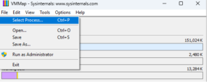 3.Accesam aplicatia VMMap si selectam procesul dorit pentru analiza;