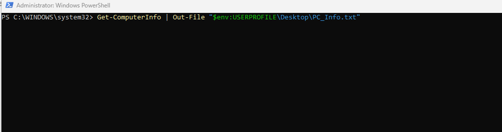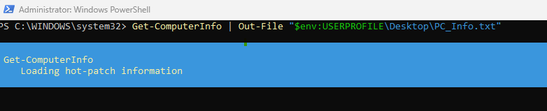 Get-ComputerInfo | Out-File “$env:USERPROFILE\Desktop\PC_Info.txt”