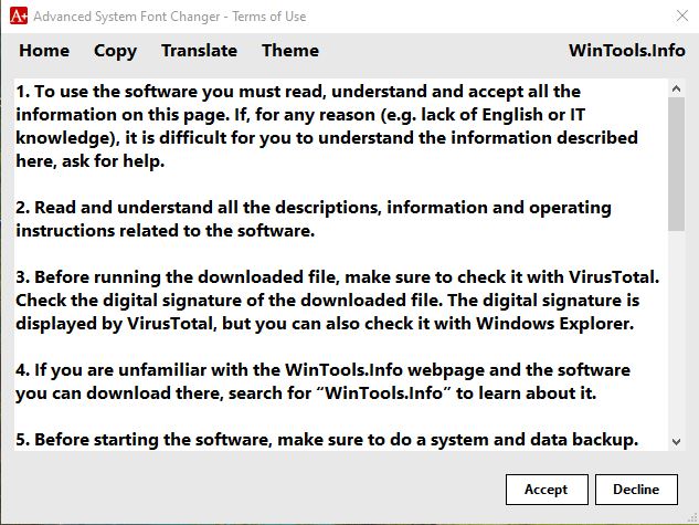 Acesta nu necesita o instalare si trebuie doar sa dam click pe Accept pentru a porni aplicatia Advanced System Font Changer