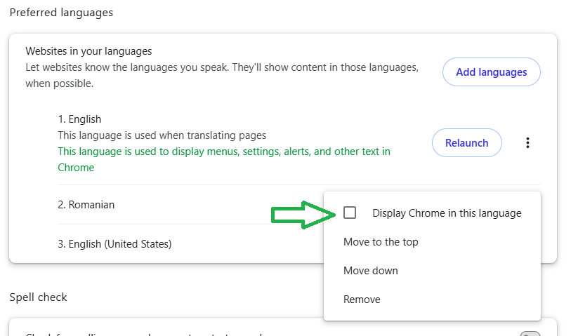 Apăsăm pe cele 3 puncte din dreptul limbii pe care dorim să o selectăm ca implicită, apoi bifăm Display Chrome in this langauge.