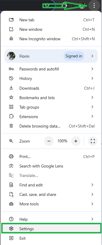 Deschidem Google chrome, în colțul din dreapta sus selectăm cele 3 puncte, apoi Settings.