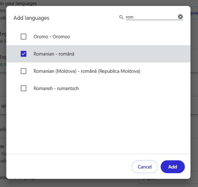 Cautăm limba pe care dorim să o adaugăm, o selectăm și apăsăm pe Add.