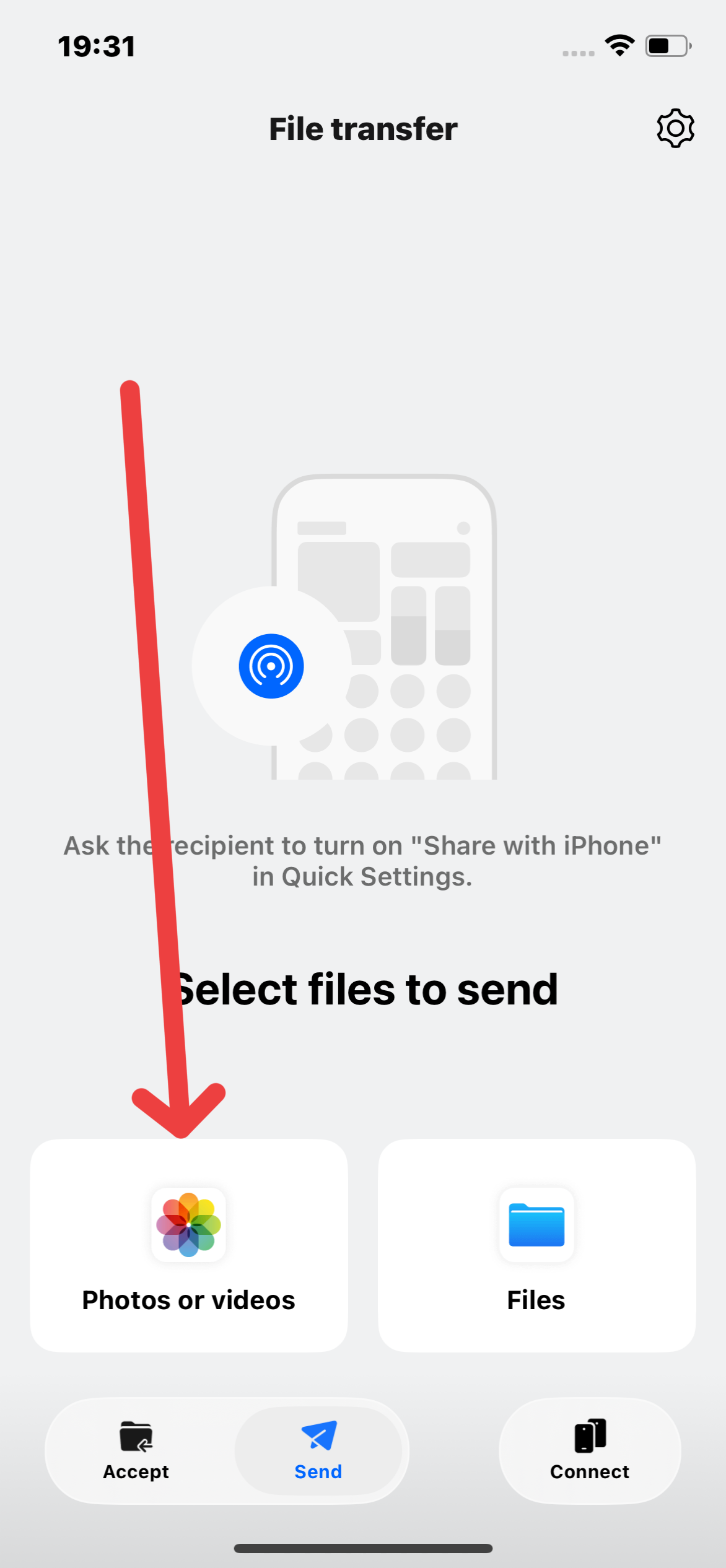 Cauta butonul Share with iPhone or PC in lista de scurtaturi (daca nu este, apasa pe “Edit”, adica iconita cu creionul din dreapta-sus si adauga-l)