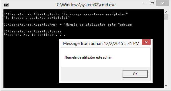 echo "Se incepe executarea scriptului" @set a=%username% msg * "Numele de utilizator este "%a% pause In acest stagiu, documentul nu poate fi executat pentru ca este de tipul text si de aceea trebuie sa fie modificata extenisa fisierului in .bat sau .cmd Redenumiti deci fisierul astfel ca extensia .txt sa fie inlocuita cu una din cele doua mentionate anterior. Daca extensia nu apare la sfarsitul numelui de fisier, de exemplu script.txt atunci trebuie sa setezi din windows sa fie afisate extensiile tuturor fisierelor Dupa redenumire documentul trebuie sa fie de forma script.bat sau script.cmd. Pentru a rula scriptul trebui sa dai dublu click pe acesta, caz in care va fi afisata consola cmd si stagiul executarii comenzilor din cadrul scriptului, eventual mesajele pe care comenzile le genereaza. Scriptul cmd dat exemplu mai sus va avea drept rezultat afisarea intr-o casuta de dialog a numelui utilizatorului
