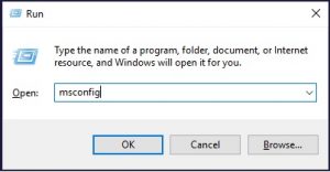 Apasati in acelasi timp tasta windows+R pentru deschiderea ferestrei Run si scrieti “msconfig” dupa aceea apasati enter:
