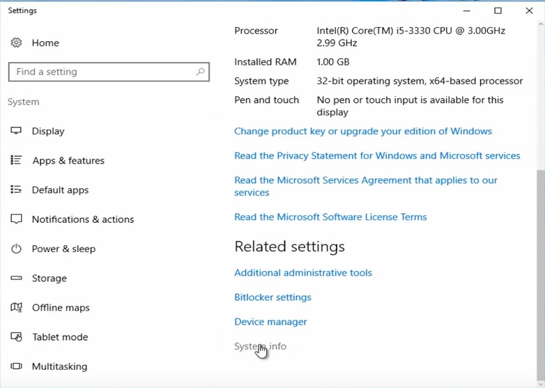 Accesati meniul start si scrieti “system”, apoi click stanga pe “About your PC”, dati scroll si dati click stanga pe “System info”.