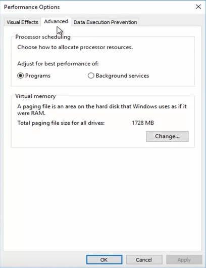 Dupa ce a aparut fereastra cu “Performance Options”, apasati pe “Advanced” si click stanga pe “Change”: