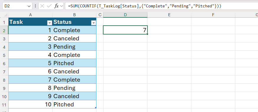 =SUM(COUNTIF(T_TaskLog[Status],{“Complete”,”Pending”,”Pitched”}))