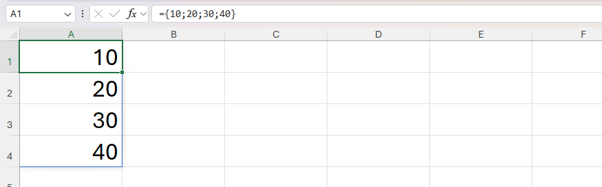 On the other hand, using semicolons between the values in the array constant returns a vertical dynamic array (in rows):