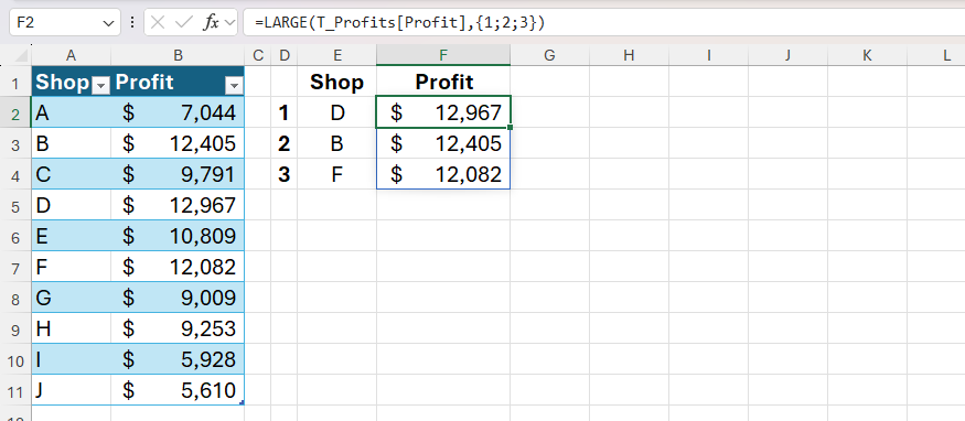 In this example, let’s say you want to return the top three profits from the table, named T_Profits, as a separate array.