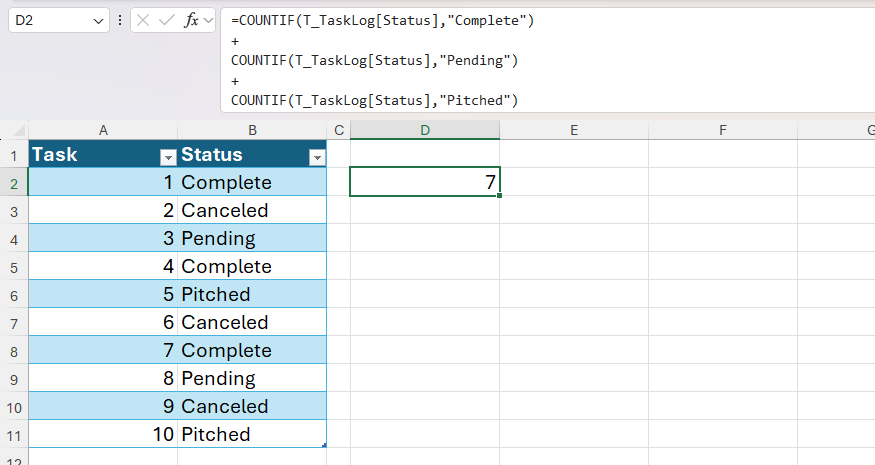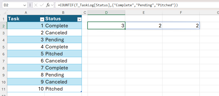 =COUNTIF(T_TaskLog[Status],{“Complete”,”Pending”,”Pitched”})