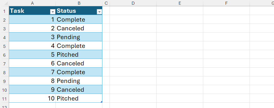 Imagine you have this Excel table, named T_TaskLog, and you want to find out the number of tasks whose status is Complete, Pending, or Pitched.