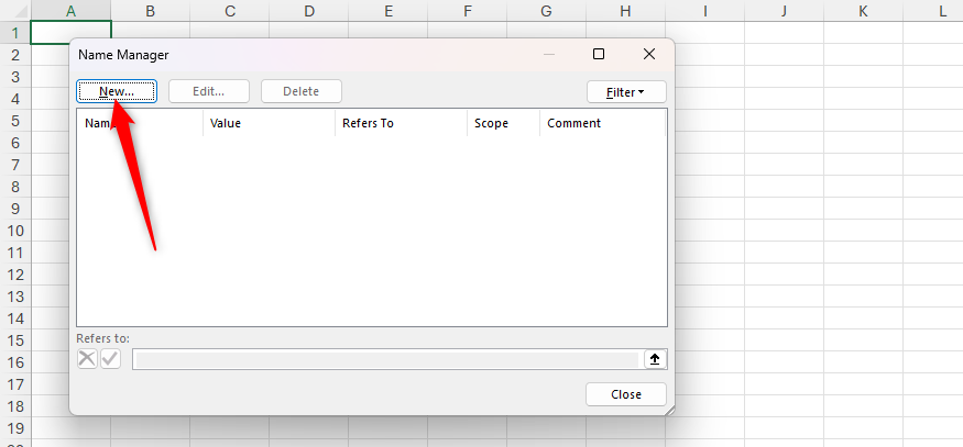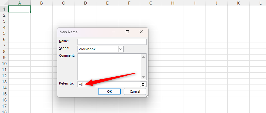 Next, in the Refers To field, type the equal sign, followed by an opening curly brace: