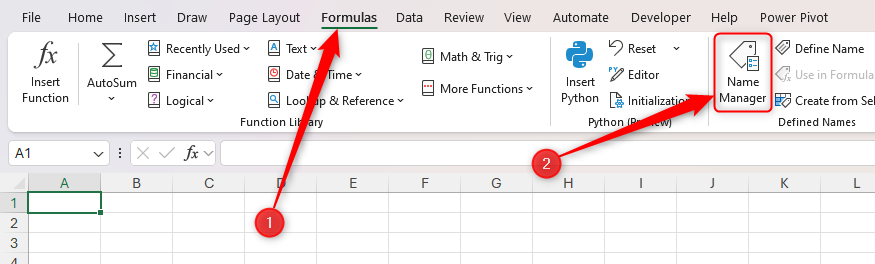 To create a named array constant, in the Formulas tab on the ribbon, click “Name Manager.”