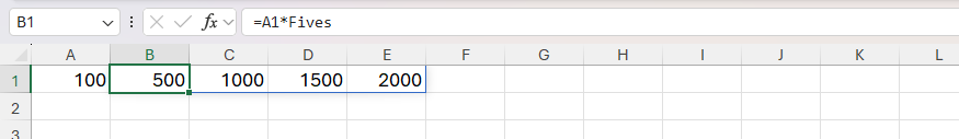 As with unnamed array constants, you can use them in formulas. In this example, the array constant named Fives is: