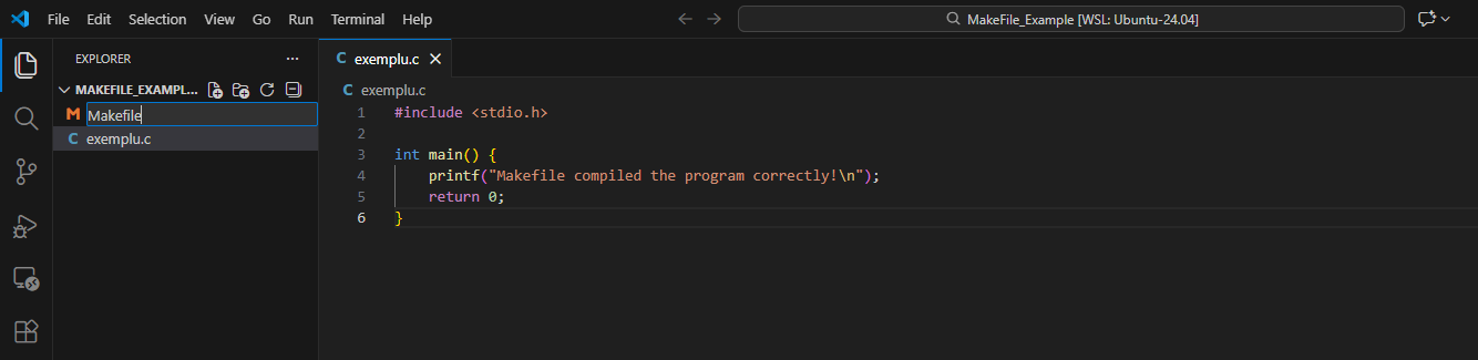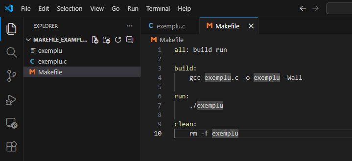 Un Makefile este un fisier text in care ii spui calculatorului: “Cand scriu cuvantul X, tu sa executi comanda Y”. Pentru a incepe, creeaza un fisier nou in folderul proiectului tau care sa se numeasca exact asa: Makefile
