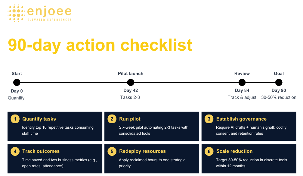 Reclaimed hours are valuable only when redeployed to high-impact activities: distinctive programming, sponsor relationship building, strategic partnerships, or advanced analytics and experimentation. A pragmatic operational cadence is a six-week savings sprint to identify low-value tasks, pilot automations, measure outcomes and convert freed hours into a prioritized strategic backlog.