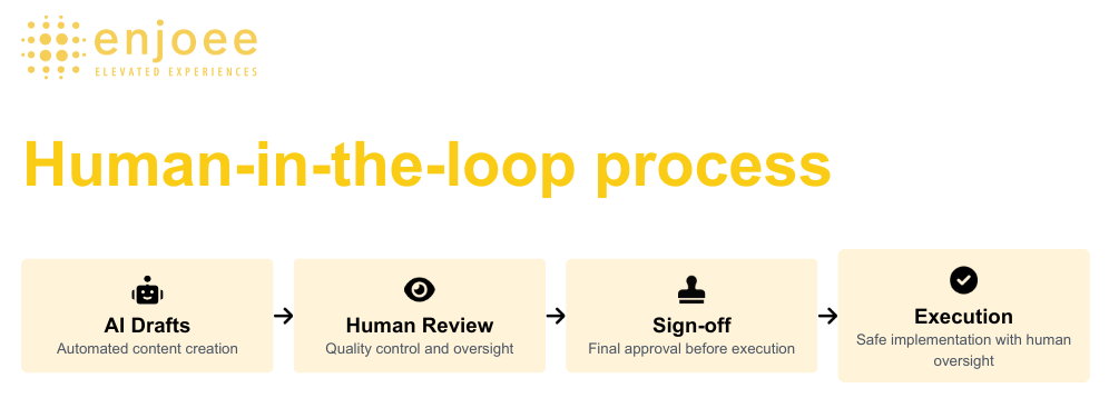Speed without guardrails invites error: poor matches, tone-deaf messaging or inappropriate data sharing. Mitigate risk with a staged “human-in-the-loop” posture: AI drafts and pre-fills; humans review and sign off. Complement this with clear consent and data-retention policies, outcome instrumentation (open rates, session lift, sponsor meeting conversions) and modest training. Pilots that include manager endorsement and short training cycles see faster adoption and higher worker comfort.