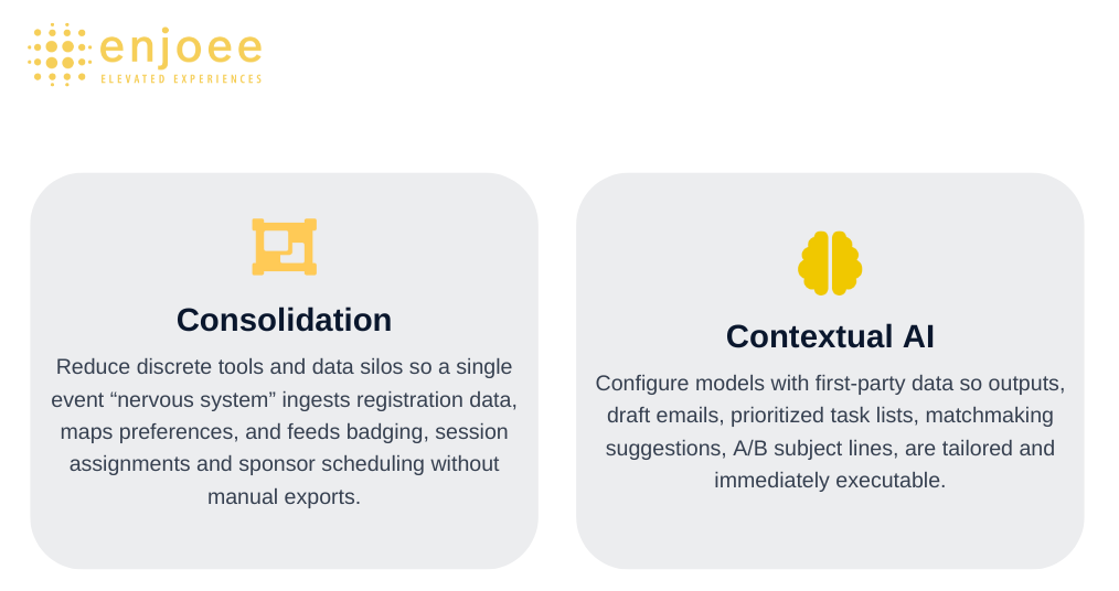 Consolidation plus contextual AI, implemented with human oversight and a plan for redeployment, turns recovered hours into a durable competitive advantage: smoother operations, richer content and stronger sponsor outcomes. Events that master this conversion will demonstrate measurable business impact.