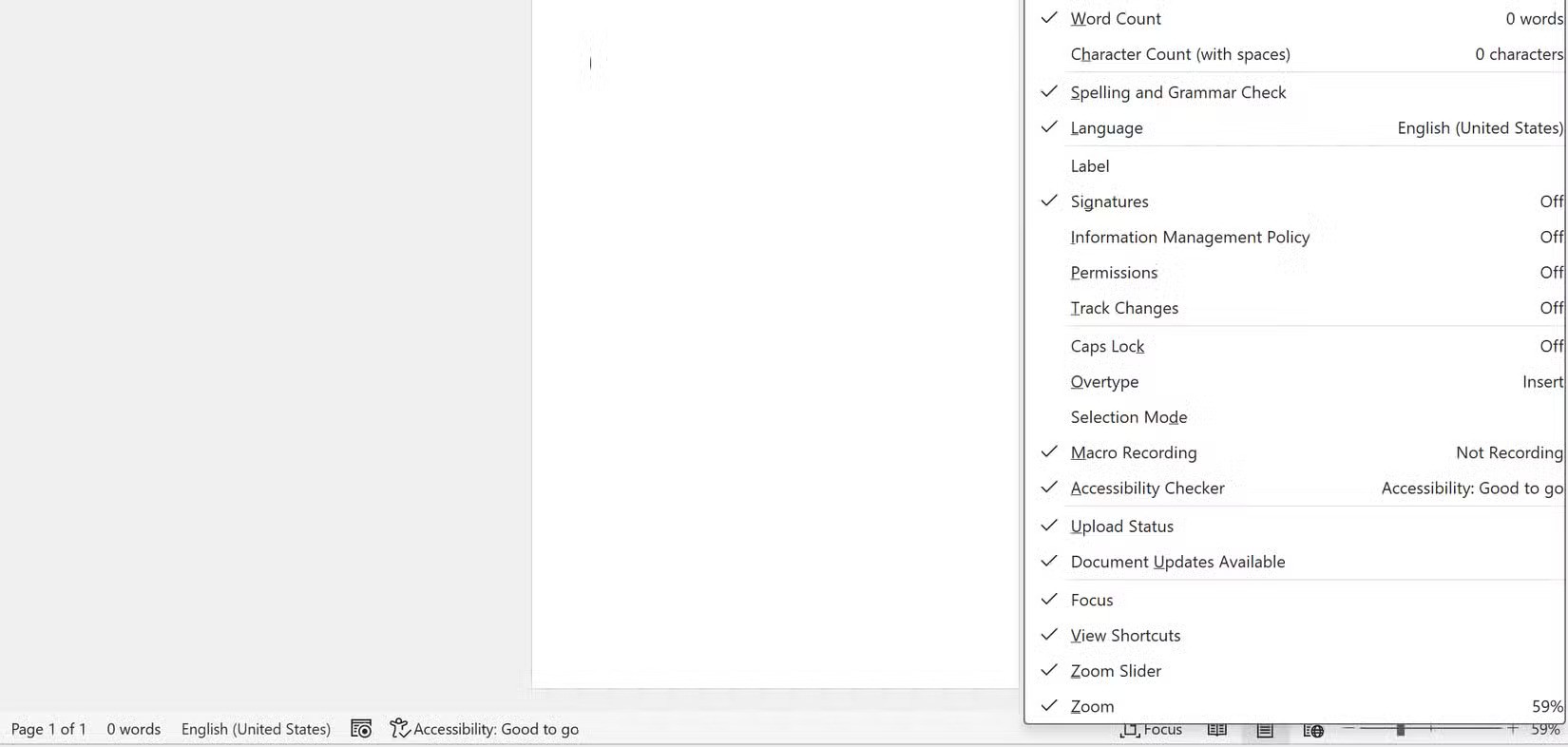 One subtle source of clutter that often goes unnoticed is the status bar at the bottom of Microsoft Word. As the name implies, it displays details like page and word counts, language, zoom level, and more. While these stats can be useful, trimming them down can make your workspace look cleaner and feel more focused.Thankfully, Word allows complete customization of the status bar. Just right-click on it, and you’ll see a list of all the items it displays. From there, uncheck anything you don’t need—perhaps keep the word count and zoom level, but remove the rest. It’s a minor change, but it makes a big difference in creating a cleaner, distraction-free workspace.