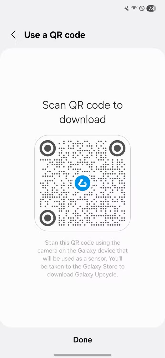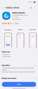 Grab up your old Galaxy phone and use the camera app to scan the QR code. This will automatically open the Galaxy Store page for the Galaxy Upcycle app. Install it. Open the app and go through the prompts. Choose whether you want the device to function as a “Light Sensor” or a “Sound Sensor”.