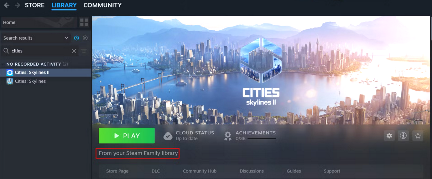 Back in the main menu, the secondary user will see the following entry in place of the usual “Play” option, denoting that the game is shared from the Family library: