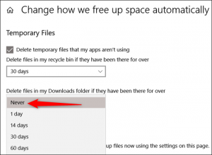 4.Now, open the “Delete files in my Downloads folder” drop-down menu and select the “Never” option
