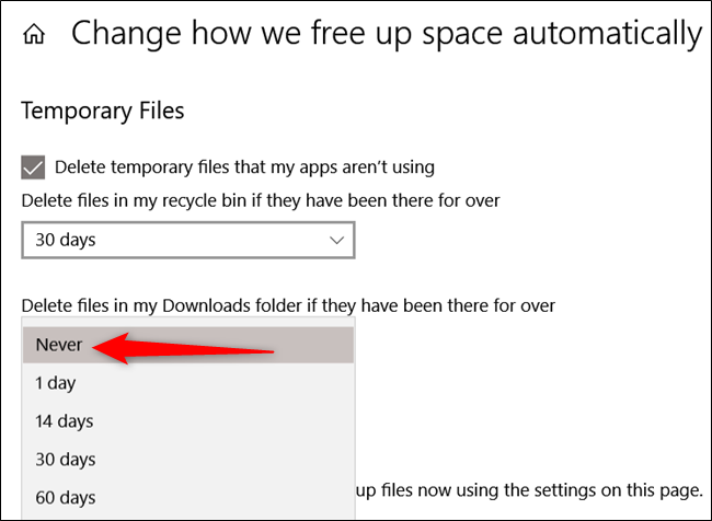 4.Now, open the “Delete files in my Downloads folder” drop-down menu and select the “Never” option