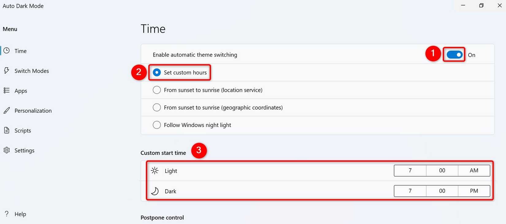 To use it, first, download and install the app on your PC. Launch the app and turn on the “Enable Automatic Theme Switching” toggle. Turn on “Custom Hours.” In the Custom Start Time section, select the “Light” field and specify the time when you want the light theme to be activated. Select the “Dark” field and specify when you want the dark theme to be activated.
