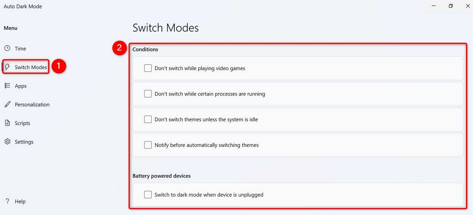 Auto Dark Mode offers various options that you can configure. To access them, in the app’s left sidebar, click “Switch Modes.” On the right pane, you can choose when the app should switch between modes.
