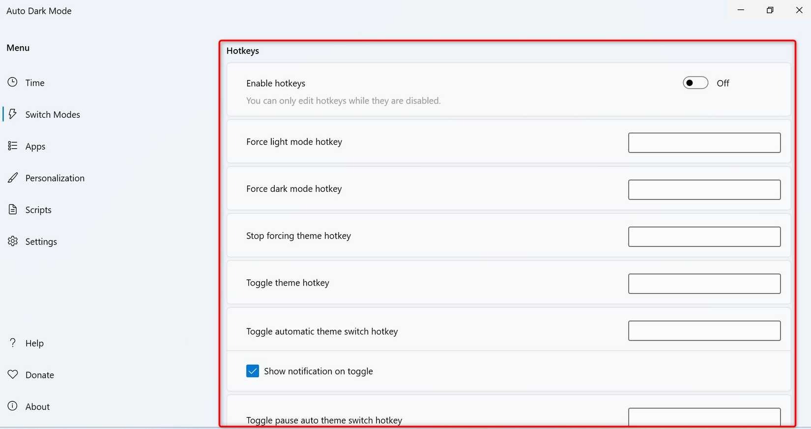Scroll down to the Hotkeys section if you’d like to assign shortcut keys that activate dark or light themes. This makes jumping between available themes easier and quicker.