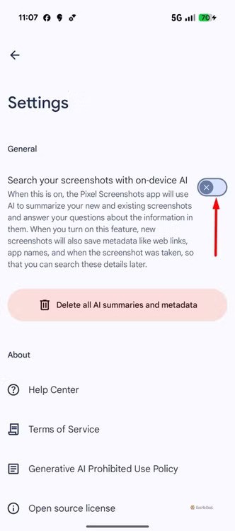 I really don’t find myself using the AI feature of the Pixel Screenshot app. If you feel the same way, you should disable AI in the Pixel Screenshot app. To do this, open the Screenshot app on your Pixel smartphone, tap the gear icon in the top-right corner, and turn off the toggle next to “Search Your Screenshots With On-device AI.”