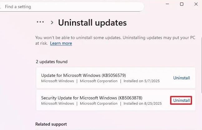 11. Click the Uninstall updates setting under the “Related settings” section.