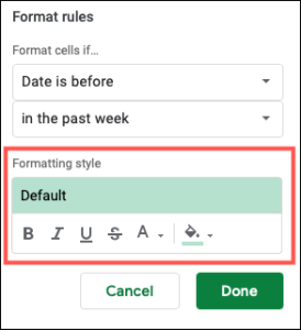 You’ll then see a default formatting style display at the bottom. But you can, of course, customize the formatting to fit your needs. You can use bold, italic, or underline, and you can apply a color to the font. You can also pick a fill color for the cell(s). If you want to apply more than one style, you can do this as well.