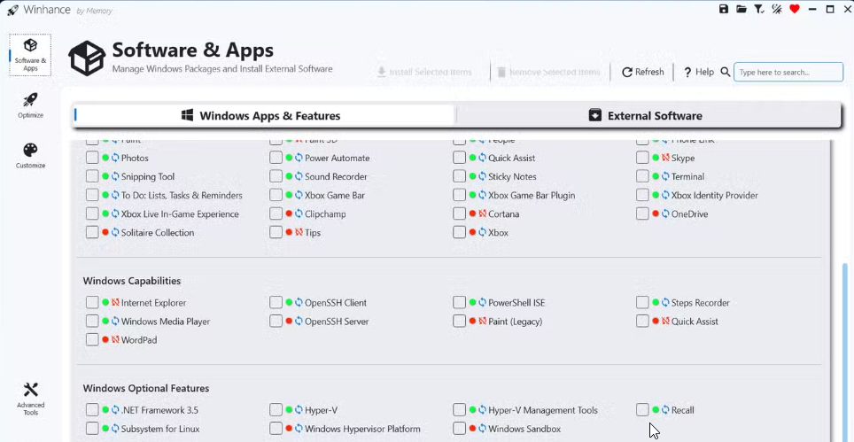 Secțiunea Software extern oferă două opțiuni. În primul rând, puteți elimina aplicațiile terțe fără a fi nevoie să faceți clic pe asistenții de dezinstalare. În al doilea rând, oferă o listă selectată de instrumente esențiale pe care le puteți instala într-un singur lot. Acest lucru este deosebit de util atunci când configurați un PC nou și doriți să adăugați rapid elemente esențiale precum 7-Zip, Notepad++, VLC și multe altele, fără a descărca fiecare aplicație separat.