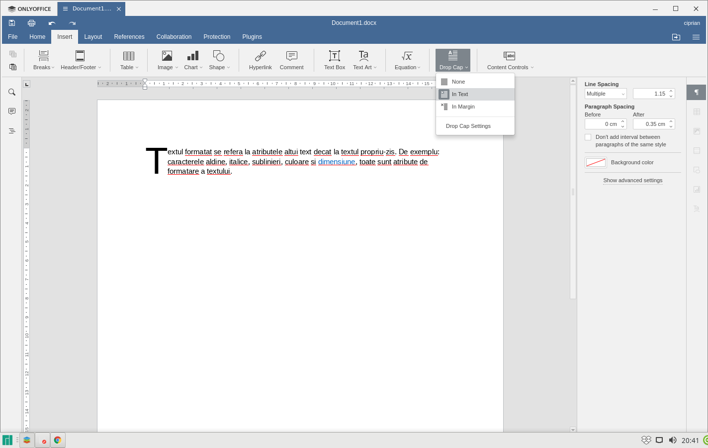 Un Drop cap este prima litera a unui paragraf, care este mult mai mare decat altele si ocupa mai multe linii in inaltime. Pentru a insera un Drop cap urmati pasii: