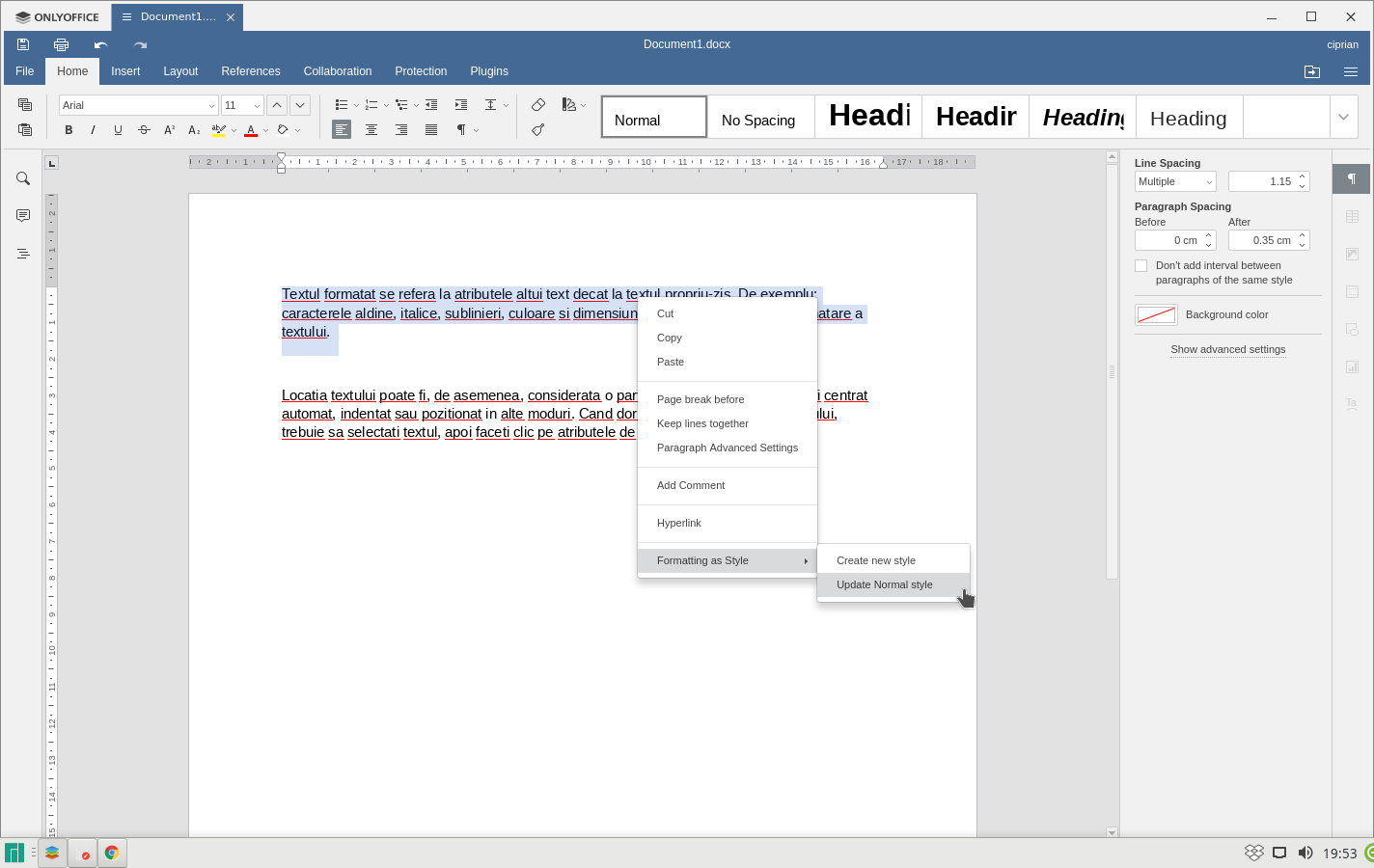 – faceti clic dreapta pe textul selectat si selectati optiunea Update Normal style
