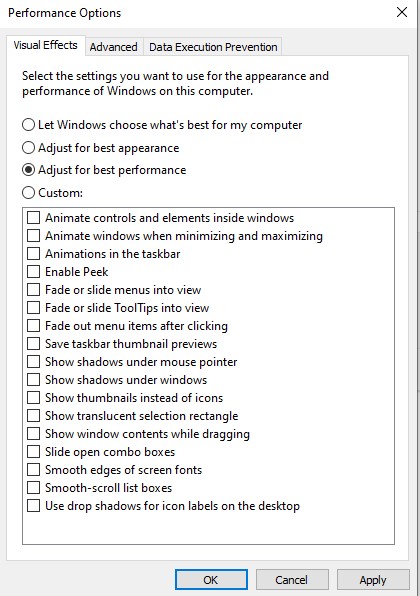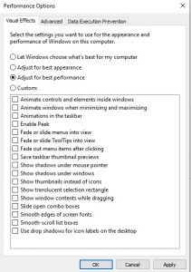 Optimizare PC Data 22/06/2020 Autor Eduard Nae Categorie Soluții 7 389 Configurare noua (How To) SituatieOptimizare PC cand avem maxim 4gb RAM. Solutie 1.Apasam bara de start. 2.Scriem Performance 3.Accesam Adjust the appearance and performance of windows 4.Bifam Adjust for best performance 5.Apasam OK. Tip solutieWorkaround Voteaza Up Down (16 din 25 persoane apreciaza acest articol) ShareTweetShare Despre Autor Eduard Nae Solutii Asemanatoare How to resolve a Windows Update Install Error – 0x80070002 2 How to move Taskbar to top or side on Windows 11 4 Reparare eroare:”Trust Relationship Failed” fără scoatere din domeniu și fără restart (PowerShell) 5 You’ve been deleting files the wrong way in Windows 5 Arduino Soil Moisture Sensor 3 Instalare și rulare model AI local (Llama3) pe server Linux folosind Ollama 3 Leave A Comment? × Cancel Reply Save my name, email, and website in this browser for the next time I comment. 3 + = 4
